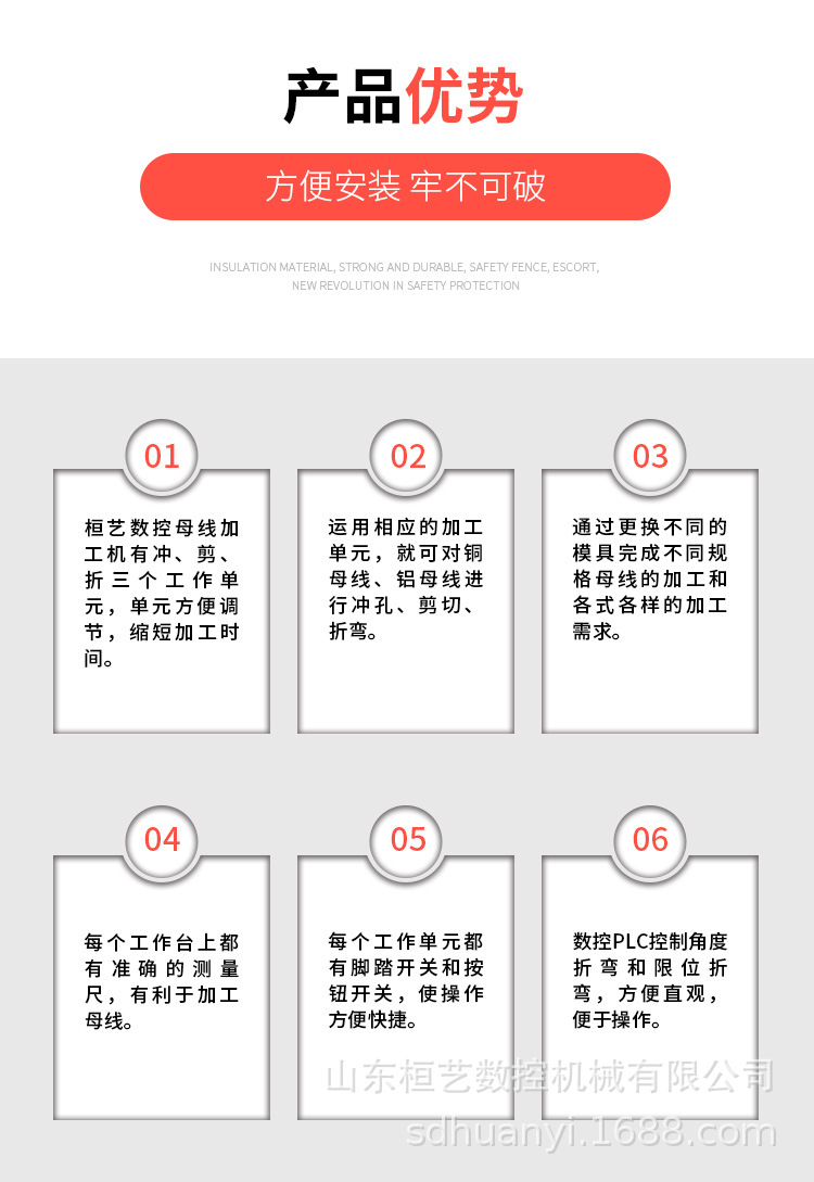 描述:本機安裝有沖孔、剪斷、折彎三個加工工位,主要功能為加工不同規格的銅、鋁母線。工作時,需要選用相應的加工工位,就能方便快捷的對銅、鋁排進行剪切、沖孔(圓孔、長圓孔),折平彎、立彎、U型彎,壓花、壓平、扭麻花、壓電纜接頭等不同的加工。?